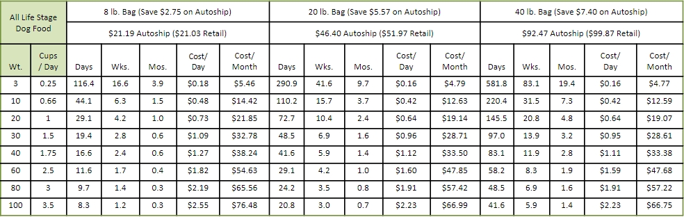 HOW MUCH DO I FEED? Your puppy will be eating approx. 1 cup per day by the time he/she is full-grown. Feeding Life's Abundance is a few dollars a day depending on your dogs weight